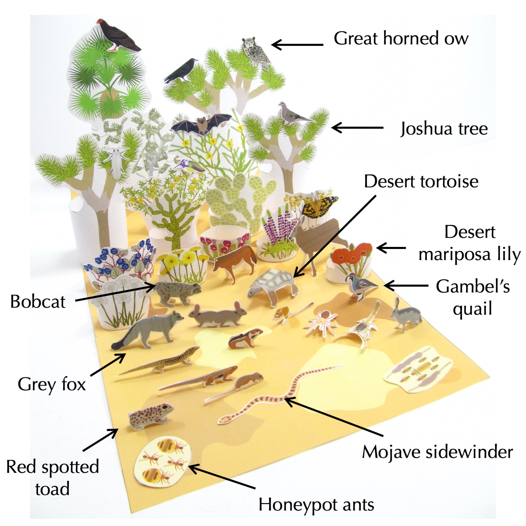Plants and animals modelled include: desert tortoise, coyote, grey fox, bobcat, black-tailed jackrabbit, big brown bat, cactus mouse, red-spotted toad, Mojave fringe-toed lizard, Gambel's quail, Mojave desert sidewinder, giant hairy scorpion, great horned owl, yucca moth, Joshua tree, desert fan palm, desert ironwood, palo verde, desert dandelion, dollarjoint prickly pear and more!