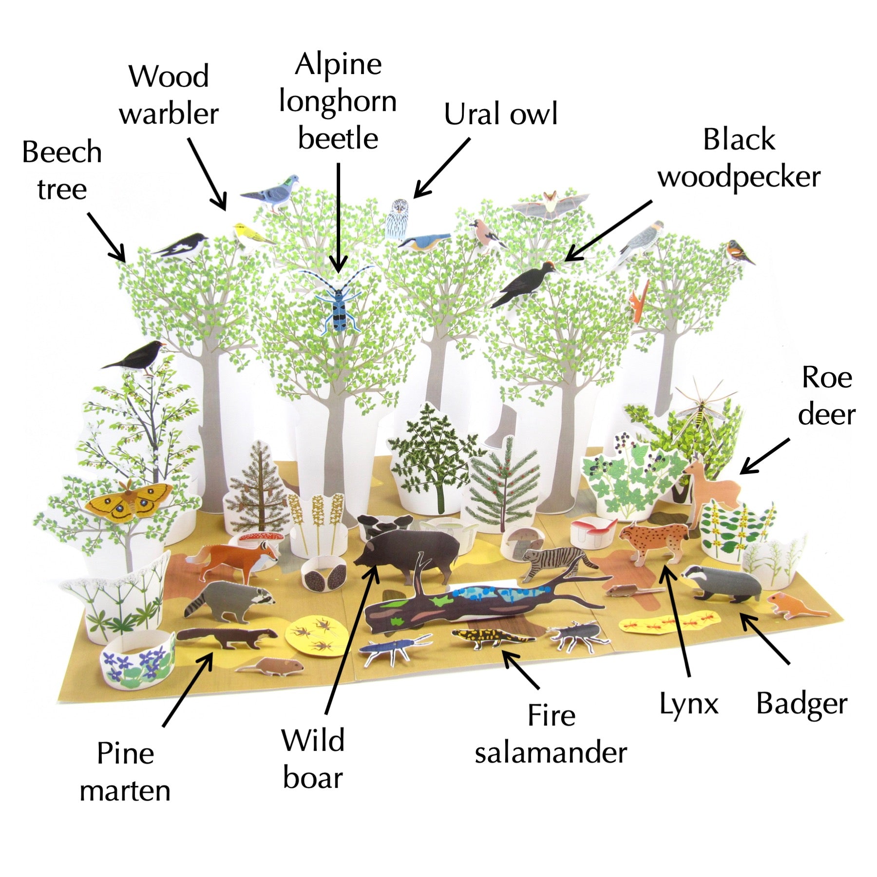 Plants & animals modelled include: lynx, wild boar, badger, roe deer, fox, wildcat, red squirrel, pine marten, bank vole, Bechstein’s bat, raccoon, Ural owl, jay, black woodpecker, sparrowhawk, wood warbler, fire salamander, brambling, tau emperor moth, Alpine longhorn Rosalia beetle, violet click beetle, wood cricket, common beech, wild cherry, holly, yew, Norway spruce, bird's nest orchid and more!